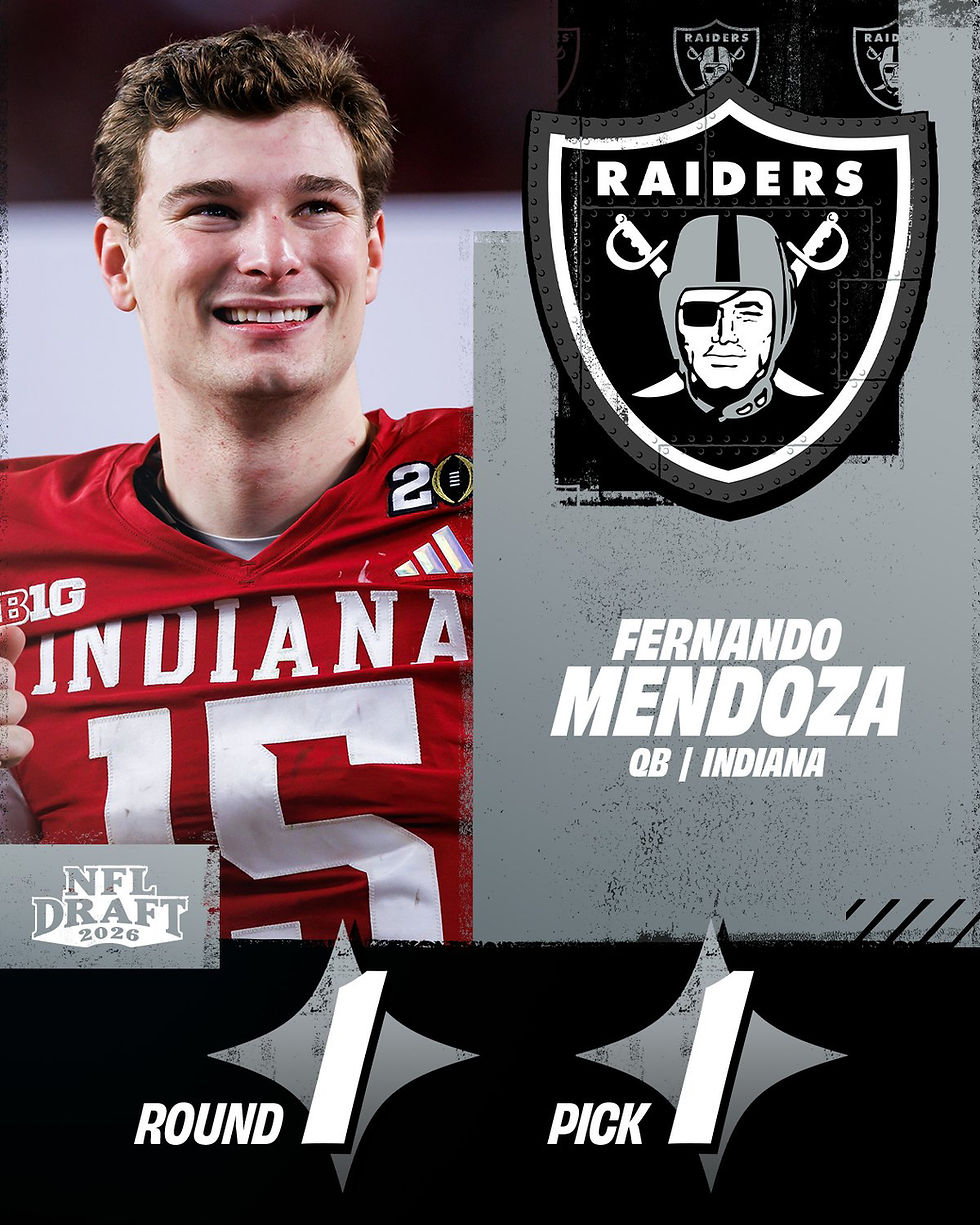 Se cumplieron los pronósticos en el arranque del Draft de la NFL 2026. Los Las Vegas Raiders no dudaron y tomaron al mariscal de campo Fernando Mendoza, proveniente de la Universidad de Indiana, con el pick número 1, apostando por convertirlo en la nueva cara de la franquicia.